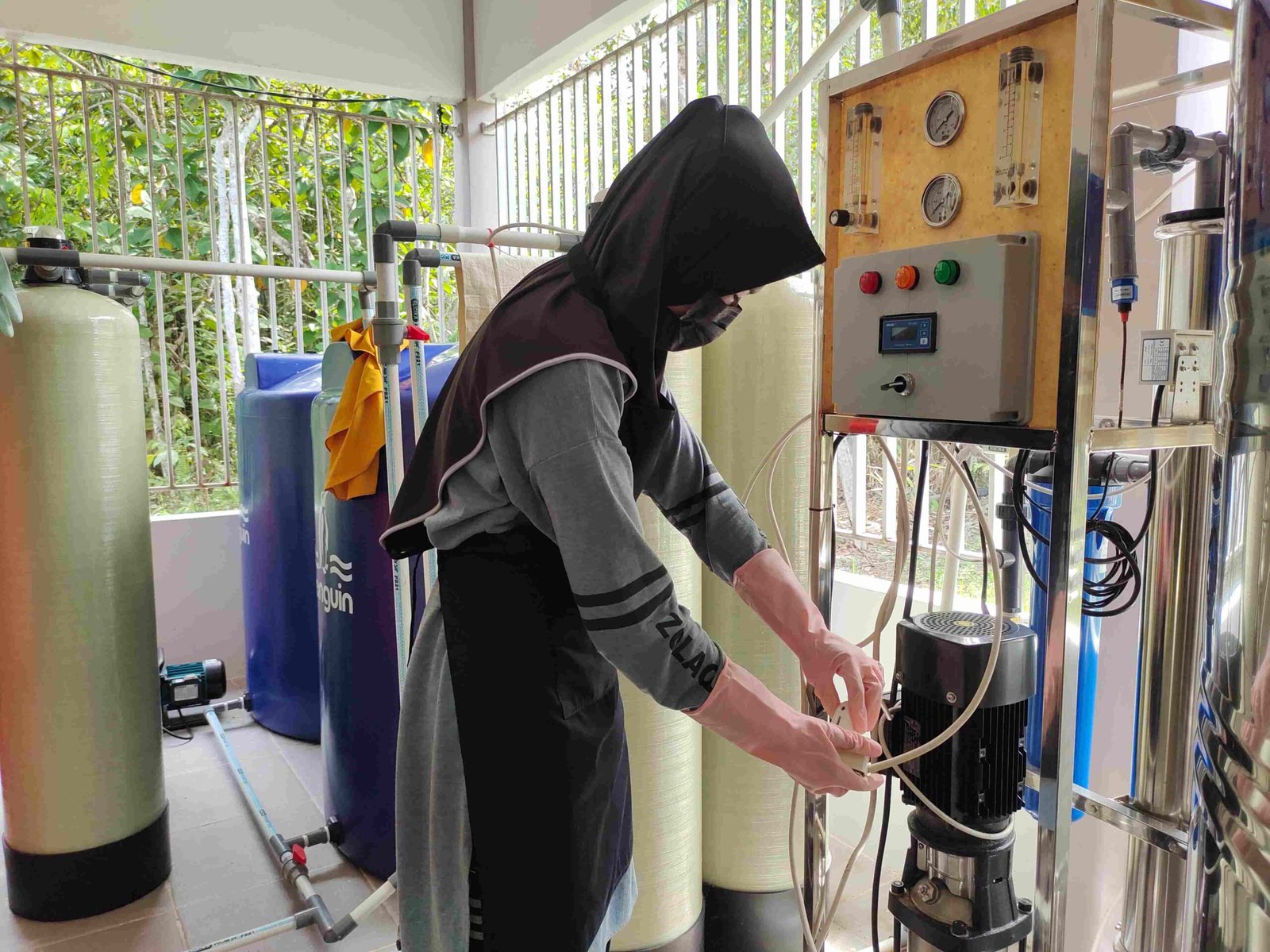 Anggota KUPS Air Galon/Kemasan sedang mengoprasikan alat penyaring air untuk proses pengolahan air bersih sebagai bagian dari kegiatan pengembangan usaha masyarakat sekitar hutan.